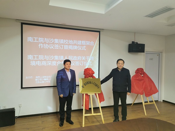 随后崔新明与沈东平、睢宁县职业教育中心校长胡居春签订了校地共建框架协议及跨境电商合作协议,并与睢宁县、沙集镇相关领导共同为“一带一路双创国际人才交流中心”、“南工院睢宁跨境电子商务实训基地”、“南工院睢宁博士工作站”、“沙集镇跨境电商运营团队”进行揭牌。