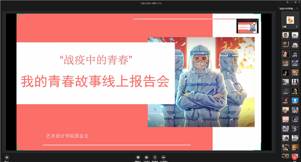 为贯彻落实习近平总书记关于坚决打赢疫情防控阻击战的重要指示精神,引导广大青年学生积极学习身边的优秀榜样,厚植家国情怀,加强青年学生思想道德建设,培养德智体美劳全面发展的时代青年,4月26日晚,艺术设计学院团总支举办了 “战疫中的青春”——我的青春故事线上报告会。报告会采用企业微信线上直播的形式,时长1小时的活动受到了200余名艺术学院同学的关注。视觉1711班徐敏、视觉1811班丁健、环艺1813班陈龙、展示1811班施涛、环艺1913班刘淇、环艺1921班彭苏畅等7名优秀战“疫”志愿者分享了他们在疫情期间参加志愿工作中的所见所闻、所感所思,积极传递青春正能量,为居家战“疫”的同学们带去了信心与力量。报告会由学院团总支书记陆永康老师主持。