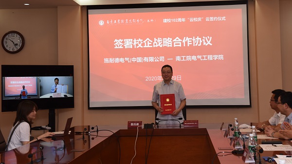5月29日,电气工程学院与施耐德电气(中国)有限公司以“云签约”的形式签署战略合作协议。本次云签约活动由华体会在线登录官网科技处、发展合作处处长孟庆杰主持,学校党委委员、副校长崔新明,电气工程学院院长杨战民,施耐德电气工业自动化业务副总裁、OEM业务负责人崔志达,科技处、发展合作处、机械工程学院、电气工程学院、航空工程学院、商务贸易学院、艺术设计学院以及各签约企业相关负责人出席了签约仪式。