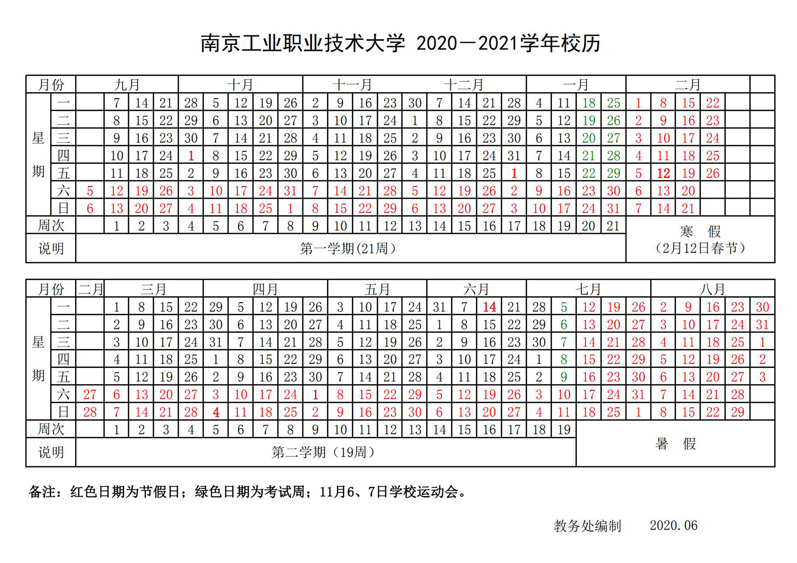 2020-2021学年校历
