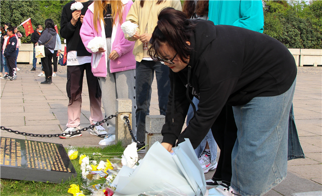 4月的雨花台烈士陵园愈发显得庄严、肃穆。在烈士纪念碑前,同学们举行了简短而庄重的的缅怀仪式,大家低头默哀,将提前制作好的白色纸花放在纪念碑前,表达对革命先烈的深切哀悼和敬仰之情。