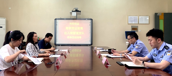 6月3日下午,南京市公安局出入境管理支队警官祝军、陈云鹤、杨睿来校指导华体会在线登录官网来华留学生管理工作。国际教育学院直属党支部副书记张莉、留学生管理人员参与调研。
