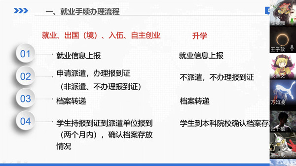 首先,赵秋致辞。他热烈欢迎毕业生成功返校,并与同学们共同回忆了难忘的在校时光。对即将毕业的同学们表达了真挚的祝福,希望毕业生知恩于心,感恩于行;强化担当、树立榜样;立足基层、踏实工作;铭记“敬业乐群”校训,把“手脑并用、学做合一”的精神带到未来工作岗位,发扬光大,为母校争光添彩。随后,张平以及教学办老师就毕业资格审查、补交学费等相关事项以及学生关心的问题进行了详细的介绍。学院邀请了招生就业处陈赛珊老师对毕业生就业派遣和档案专递手续如何办理进行了专题讲座,重点针对就业派遣中报到证的打印和签发,以及档案专递的工作进行详细的解读。辅导员们就毕业生离校手续办理、党团组织关系转出等问题进行具体说明,对宿舍安全、财产安全、网络诈骗等现象做了重点提醒,确保毕业生离校环节平稳有序推进。最后,张莉就毕业生升学和整体就业情况做了介绍,并对毕业生提出殷切希望:一是树立正确的就业观和择业观,未就业促落实。二是心怀感恩之情,参与学院开展的“毕业生赠言捐书——我为母校做一件事”、“就创业经验交流”、优秀毕业生事迹报告会等系列活动。三是秉持南工本色,严守安全底线,文明离校。四是坚守初心使命,仰望星空,脚踏实地,展示南工人风采。