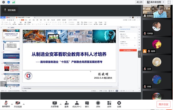 为适应职业本科教育发展的新形势和经济社会发展对人才培养提出的新要求,全面推进学院的教育改革和发展,5月4日下午,电气工程学院邀请机械工业教育发展中心主任、中国机械工业联合会教育培训部主任、全国机械职业教育教学指导委员会主任委员陈晓明以腾讯会议形式作《从制造业变革看职业教育本科人才培养——面向装备制造业“十四五”产教融合高质量发展的思考》专题报告,报告由党委常委、副校长潘旭海主持,电气工程学院全体教职工及兄弟学院老师聆听了报告。