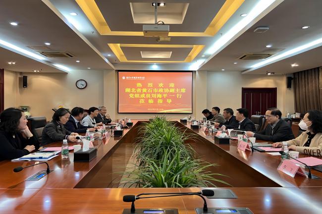 4月12日下午,湖北省黄石市政协副主席、党组成员刘海平一行来校考察调研。南京市政协社法(民宗)委副主任顾立春,提案委副主任、社法(民宗)委办主任林海燕陪同调研。党委常委、副校长苏小冬以及科技处、机械工程学院等部门负责同志在仙林校区行政楼辅楼一楼会议室接待了来宾。
