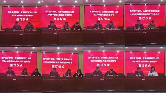 随后,毛文娟、孔伟分别与学院领导班子成员、党支部书记、系主任代表签订《意识形态工作责任书》《安全稳定责任书》《网络信息安全责任书》《师德师风责任书》和《2024年度专业系部目标任务书》。