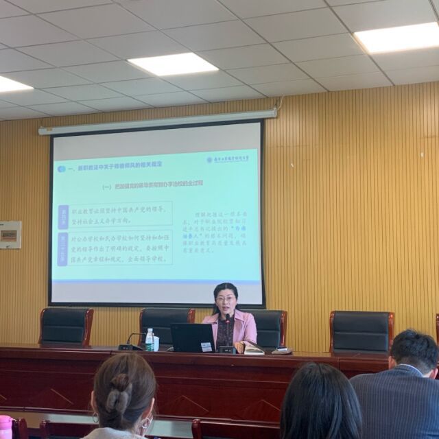 为更好深入学习贯彻习近平总书记关于新时代师德师风建设的重要论述,落实立德树人根本任务,扎实推进高素质教师队伍建设,4月10日下午,公共基础课部邀请学校党委教师工作部部长、人事处处长张莉作师德师风专题讲座。公共基础课部全体教师在乐业楼428会议室共同聆听讲座。讲座由公共基础课部党总支书记王丽丽主持。
