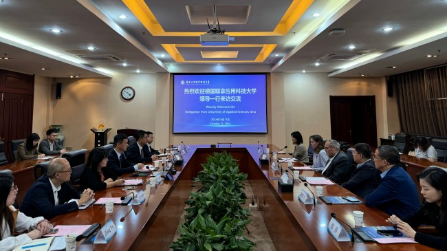 10月11日,德国耶拿应用科技大学(University of Applied Science Jena)校长斯蒂芬·泰歇特(Steffan Teichert)一行来华体会在线登录官网考察交流,江苏留德校友会执行秘书长郭胜大,华体会在线登录官网党委书记、校长谢永华,党委常委、副校长孙雁飞参加交流。双方围绕师生互访、学分互认、专业共建等进行了深入探讨。